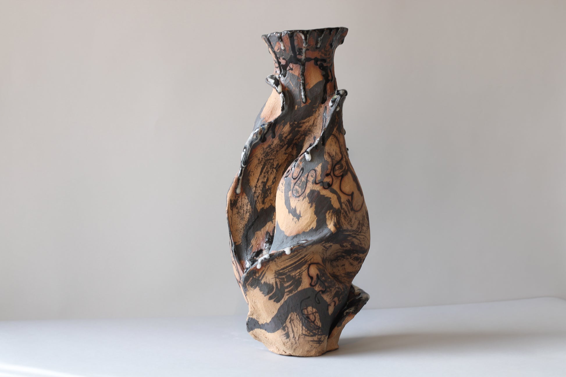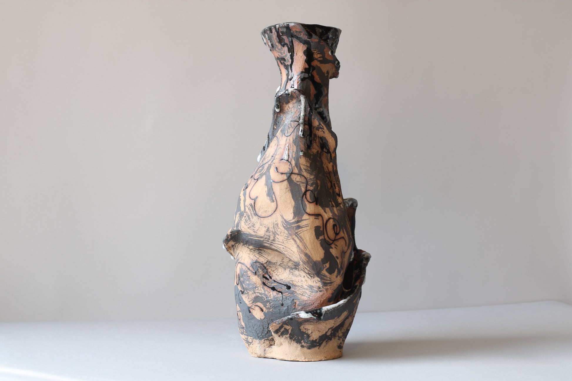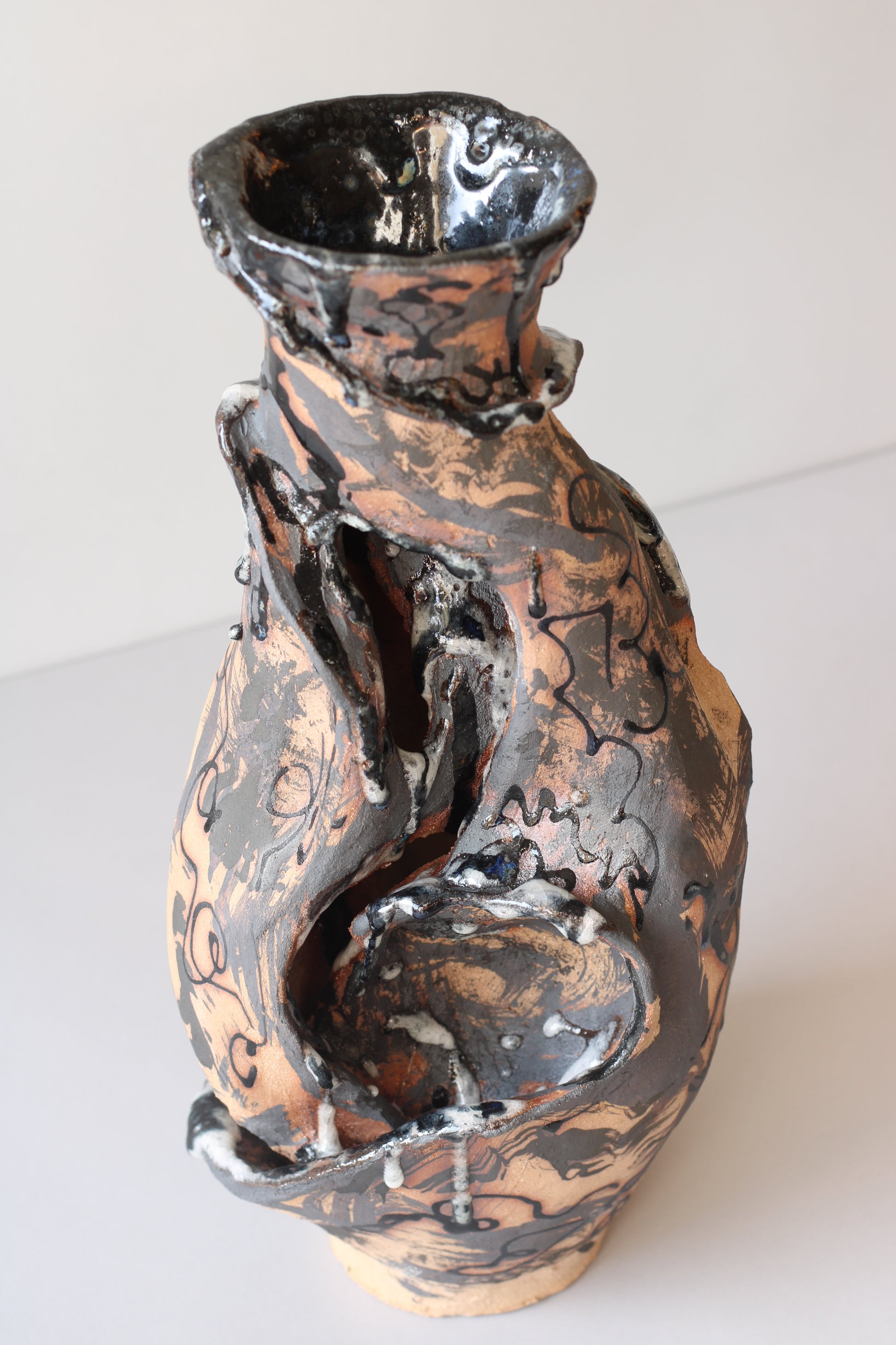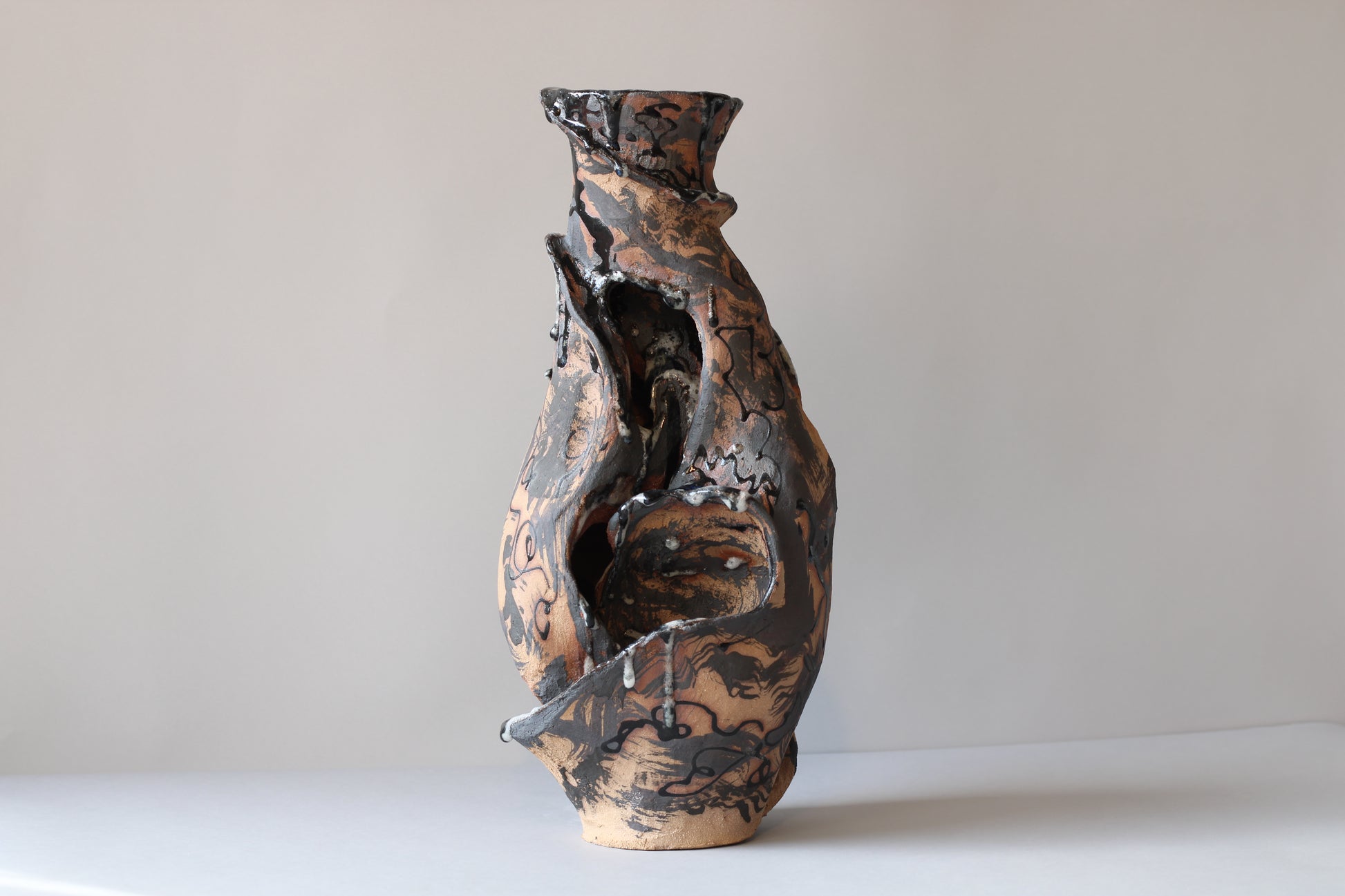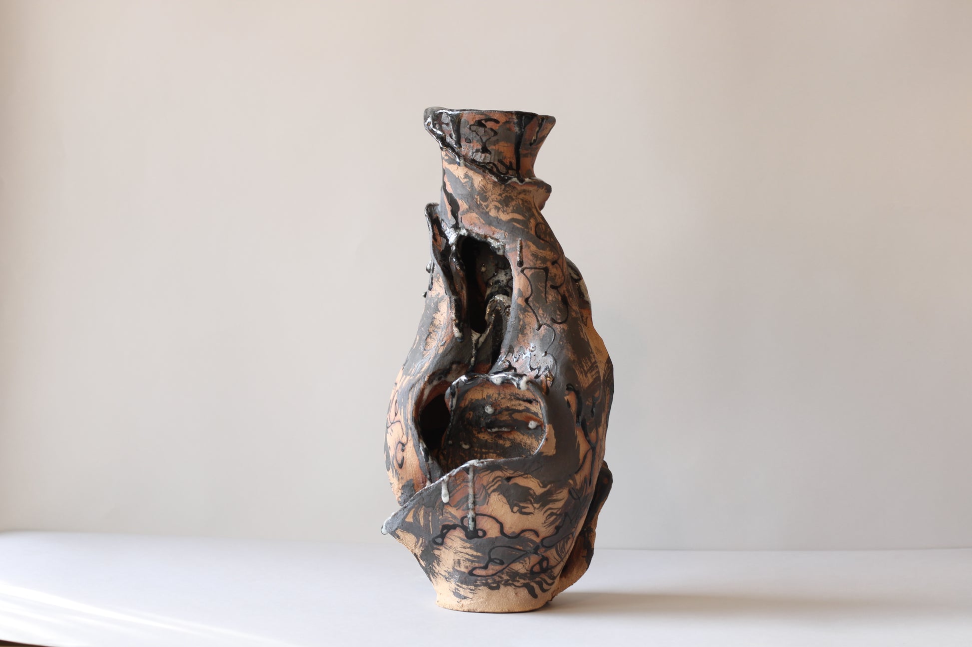 Handmade construction in high-temperature earthenware, intervened with iron and cobalt oxides and personally formulated glazes with borax and nepheline syenite. Fired at 1250ºC, this piece seeks to reveal the fragility and strength of what we hold within, inviting a process of transformation and openness